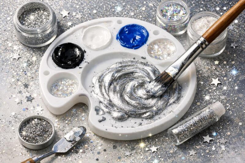 普通の絵の具だけでは金属特有の光沢感やキラキラとした輝きを完全に再現することは困難です。しかし、ラメやグリッターなどの素材を活用することで、本物の銀のような煌めきを表現できます。この章では、家庭でも簡単に入手できる材料を使って、キラキラとした銀色を作る方法を詳しく解説します。