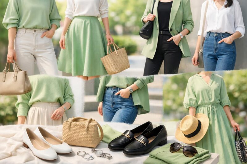 ライトグリーン色を全身に取り入れるのは少しハードルが高いと感じる方には、小物使いから始めることをおすすめします。バッグや靴、スカーフといった小物にライトグリーン色を取り入れるだけで、コーディネート全体が一気に華やぎ、洗練された印象を与えることができます。小物なら気軽に挑戦でき、シンプルなコーディネートのアクセントとしても効果的です。