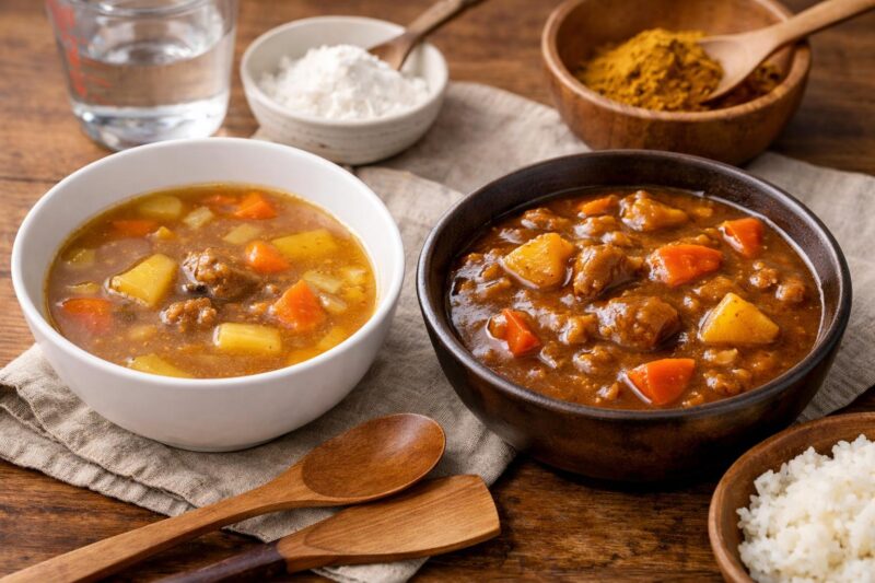 また、スパイスから手作りするカレーや、ハウス食品の「バーモントカレー」・エスビー食品の「ゴールデンカレー」など、ブランドによってルウの溶け方や水分吸収のクセが異なります。使い慣れたブランドのルウであれば、そのルウに合った水分量の感覚も身につきやすくなるため、ルウのブランドをある程度固定して使い続けることも水加減を安定させるひとつの方法です。